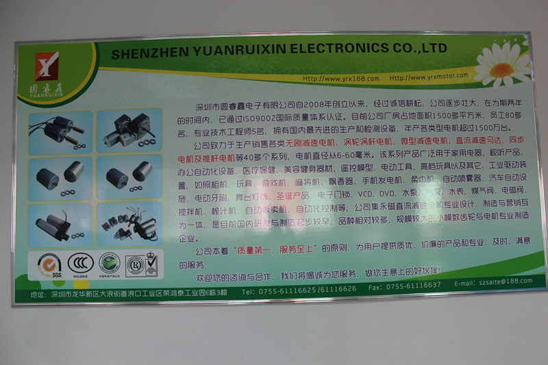 深圳市圓睿鑫電子有限公司自2008年創立以來,經過誠信耕耘,在為期兩年的時間內,已通過ISO9001:2000國際質量體系認證。公司廠房占地面積2000多平方米,員工100人,專業技術工程師6名,擁有國內最先進的生產和檢測設備,年產各類減速電機超過2~300萬臺。因公司發(fā)展需要,于2020年底,將生產基地遷往擁有最美小鎮之稱的東莞市清溪鎮,依山傍水,依托美麗的大自然環(huán)境和地方文化,全新的東莞市圓睿鑫電子有限公司將借助深圳母公司平臺,一步步走上新的臺階。 東莞公司將繼續(xù)致力于生產銷售各類無刷減速電機 渦輪渦桿電機,微型減速電機,直流減速馬達,交流手搖發(fā)電機、同步電機及空心杯電機等,電機直徑從6-60毫米為定位,系列產品廣泛用于智能家電、智能辦公自動化設備、智能醫療、美容健身器材、遙控模型、電動工具、高檔玩具以及其它工業驅動裝置,如高檔玩具、游戲機、麻將機、飄香器、手機發(fā)電機、柔巾機、自動噴霧器、汽車自動設施、電動牙刷、舞臺燈飾、圣誕產品、智能電子門鎖、VCD、DVD、水泵、氣泵、水表、煤氣閥、電磁閥、攪拌機、榨汁...